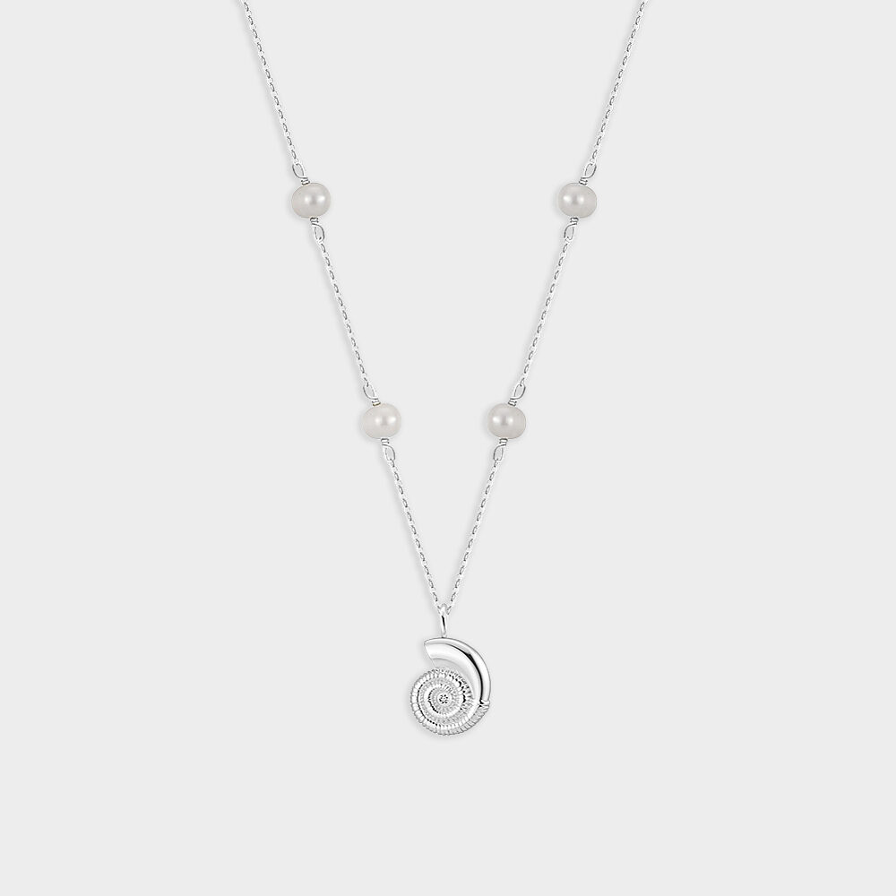 Realizzata in argento 925, presenta un raffinato pendente a spirale che richiama le conchiglie oceaniche, simbolo di armonia e rinascita. La catena è impreziosita da delicate perle che donano equilibrio e luminosità, creando un design che unisce modernità e tradizione.
