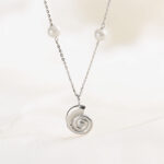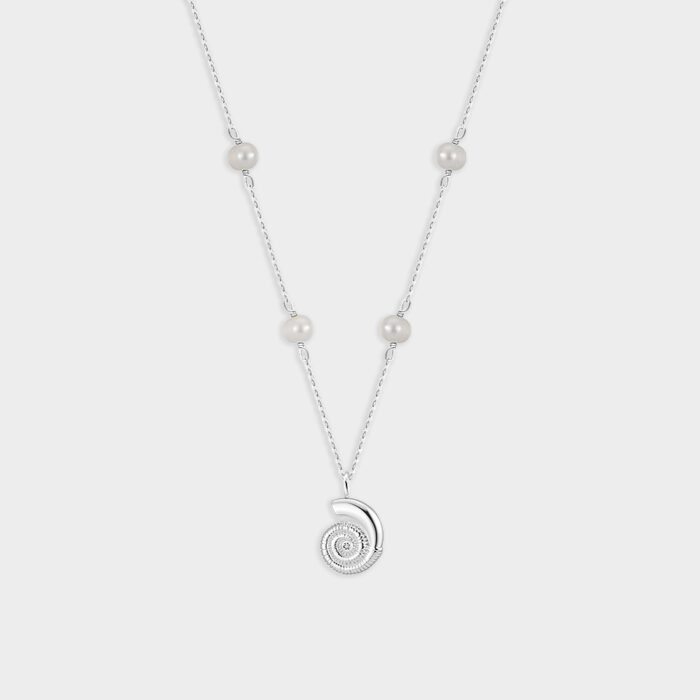 Realizzata in argento 925, presenta un raffinato pendente a spirale che richiama le conchiglie oceaniche, simbolo di armonia e rinascita. La catena è impreziosita da delicate perle che donano equilibrio e luminosità, creando un design che unisce modernità e tradizione.